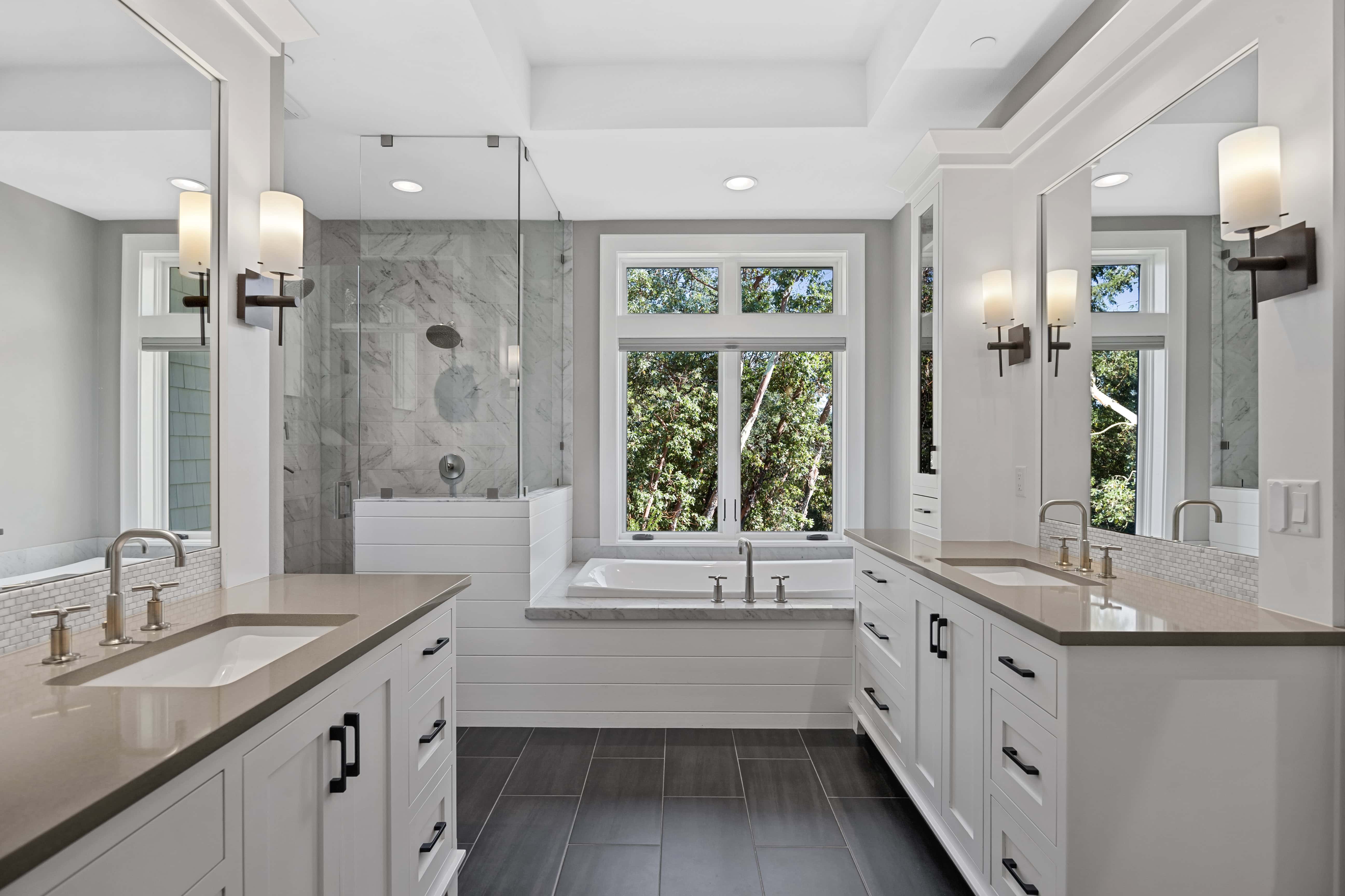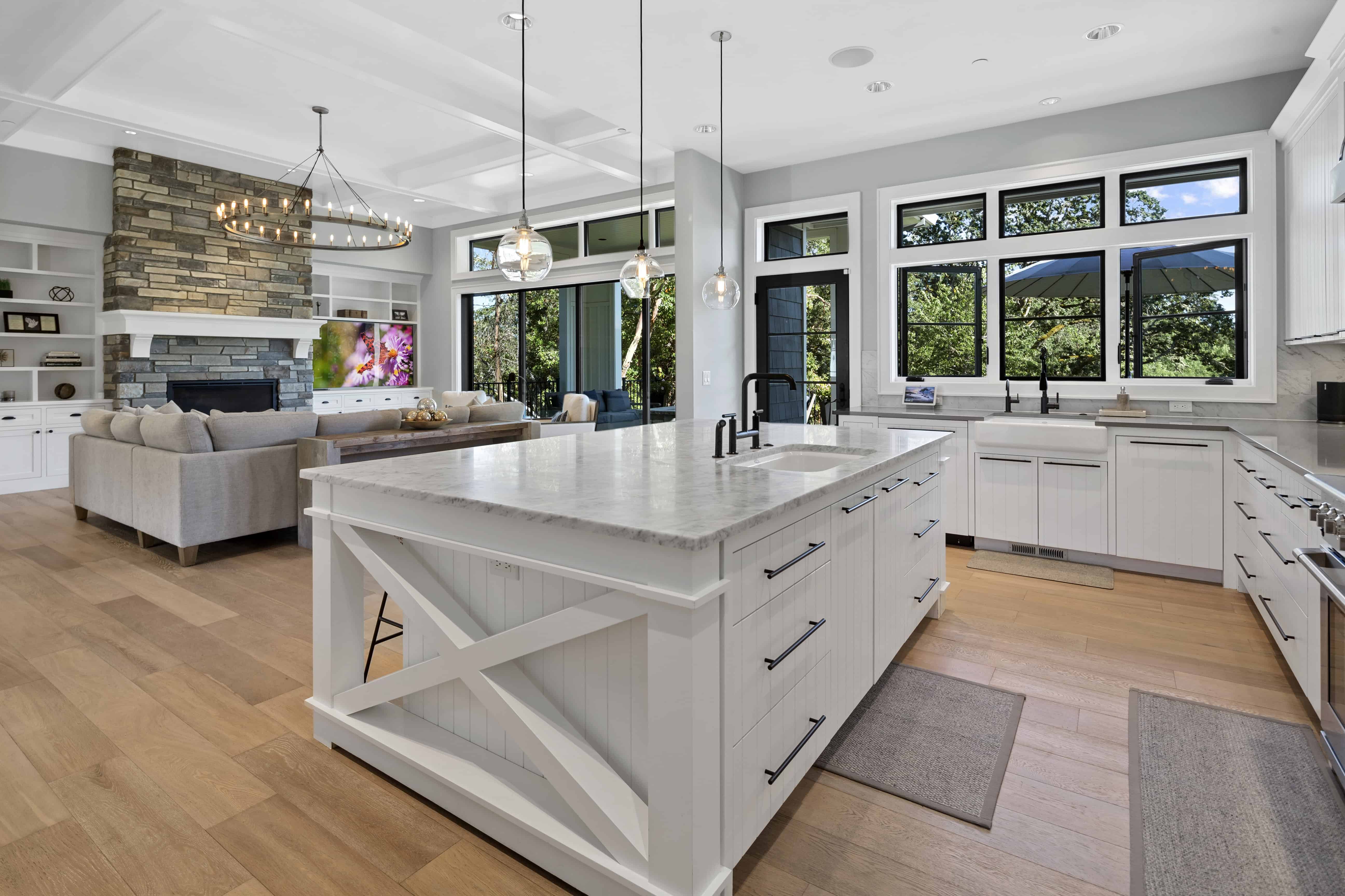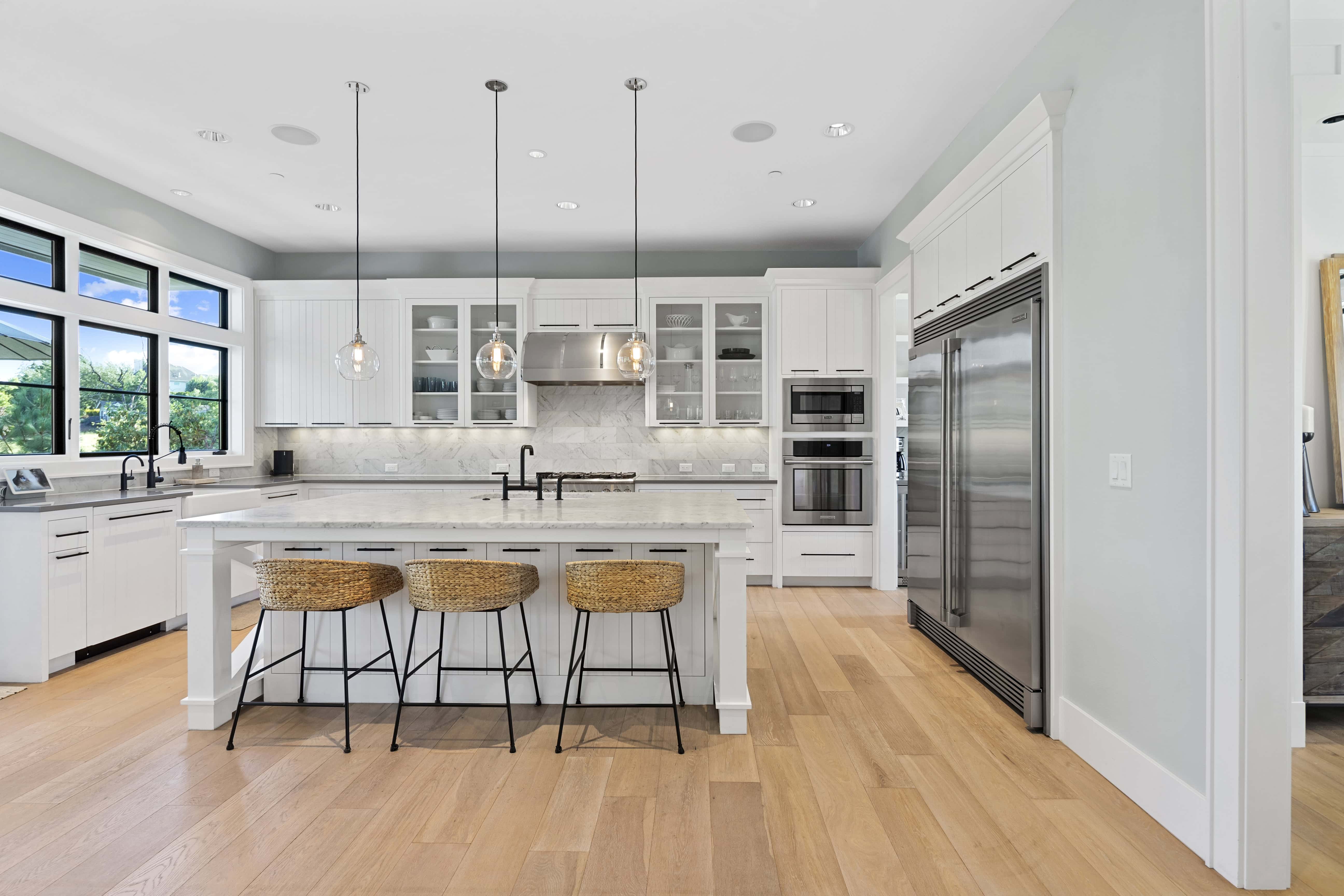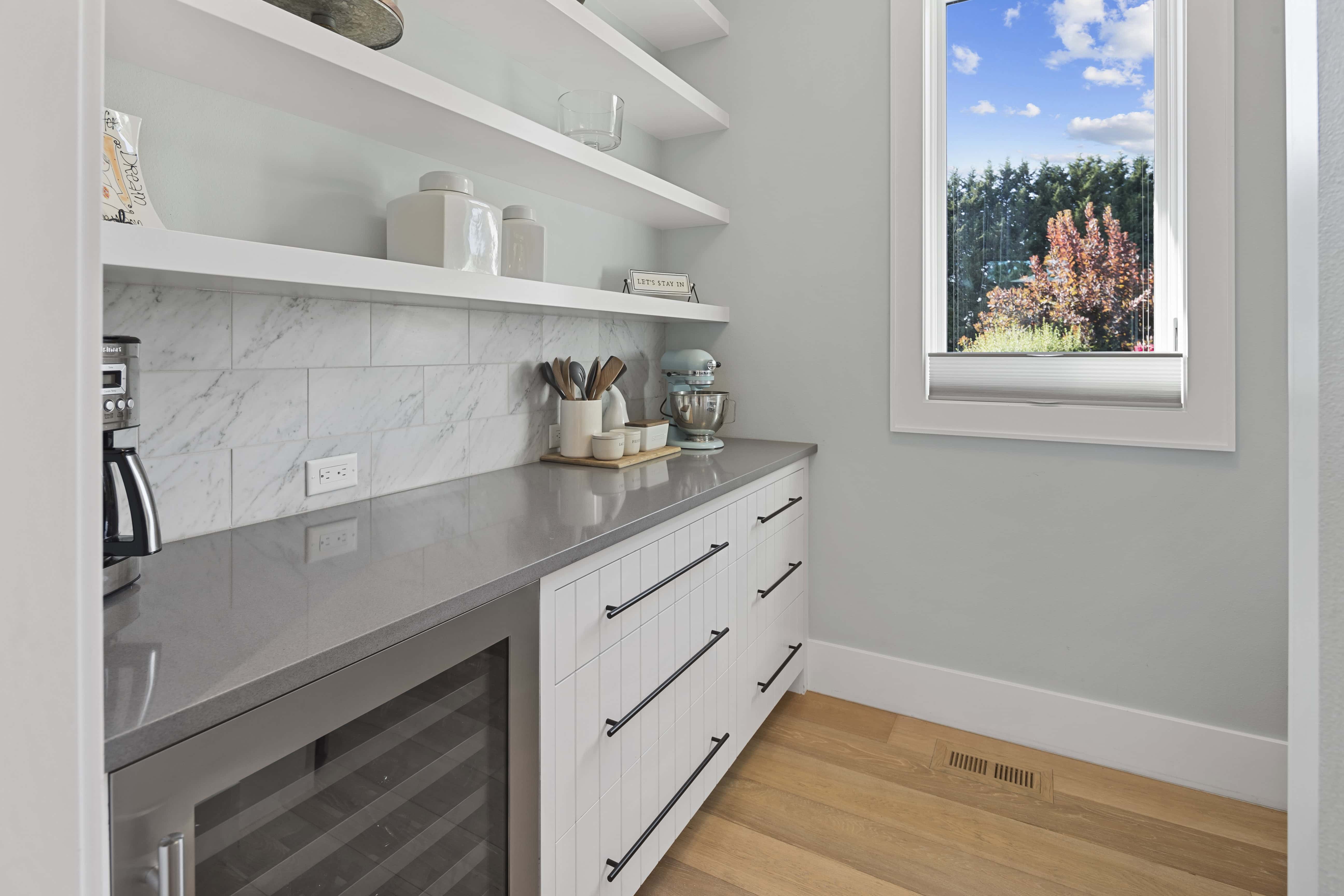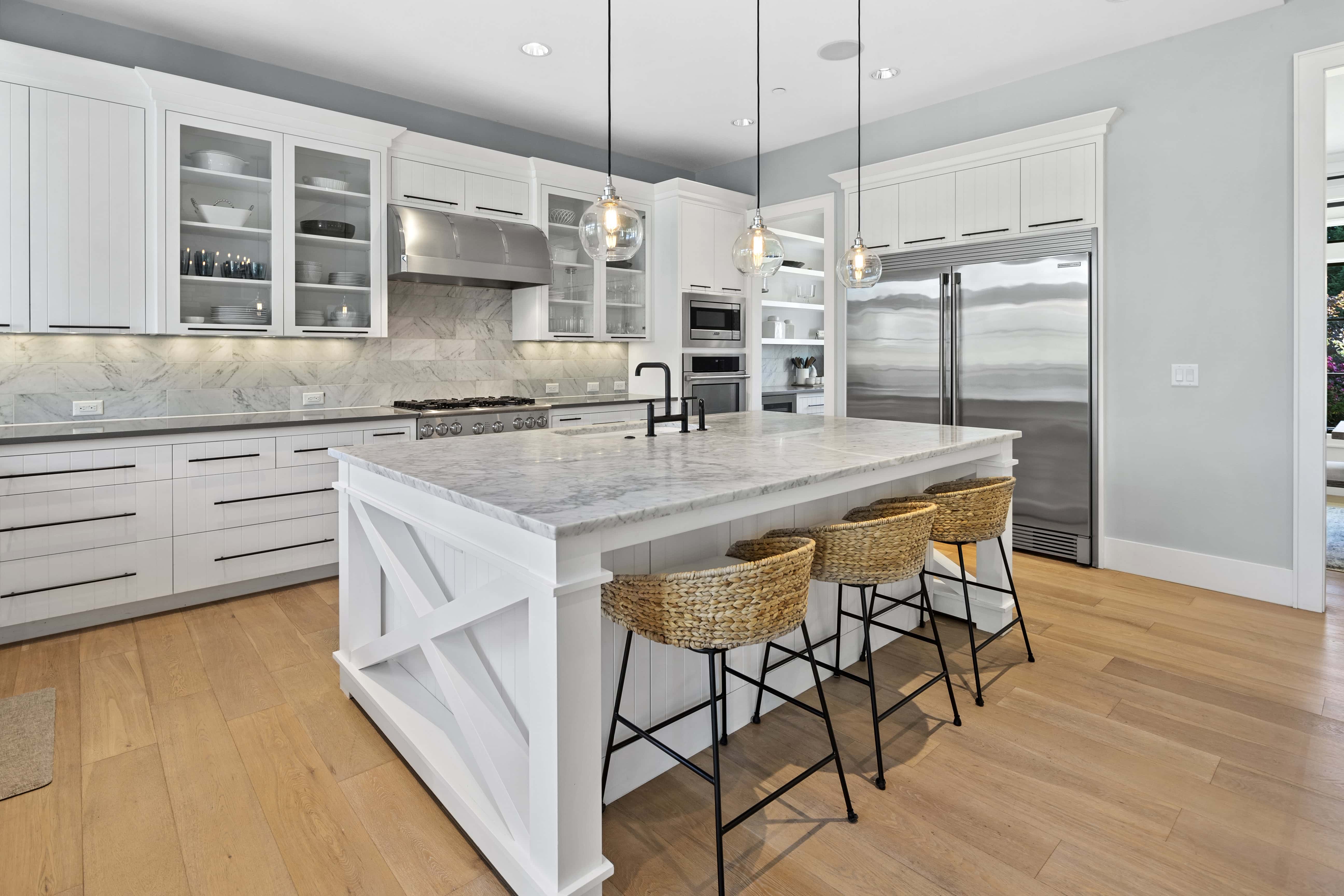 The gourmet kitchen beautifully pairs elegant shiplap cabinetry with a farmhouse sink, marble backsplash, and high-end appliances. A generous center island with marble countertops and second sink provides ample workspace, while a butler's pantry with additional prep space and a wine cooler offers convenience for larger gatherings.