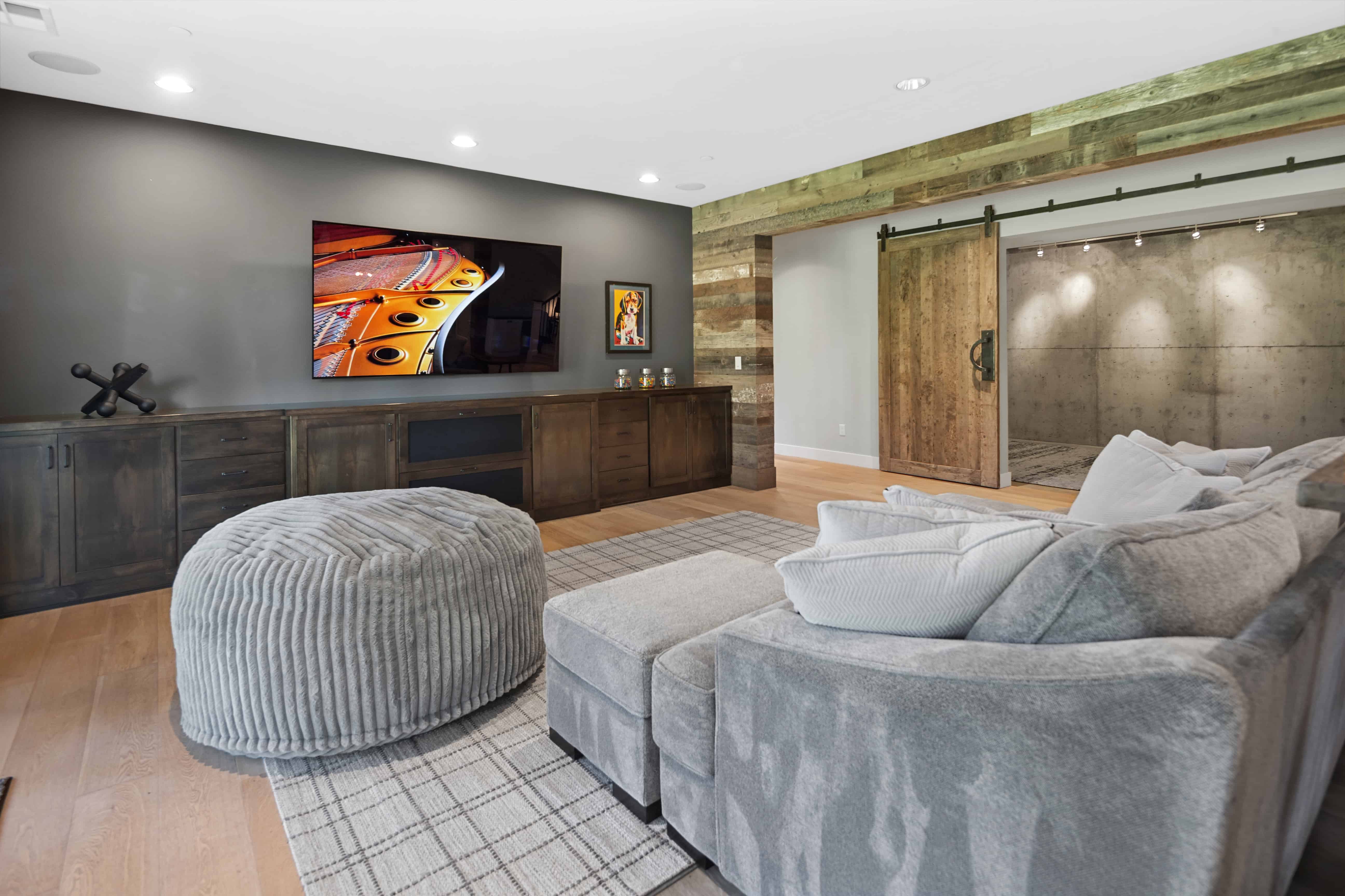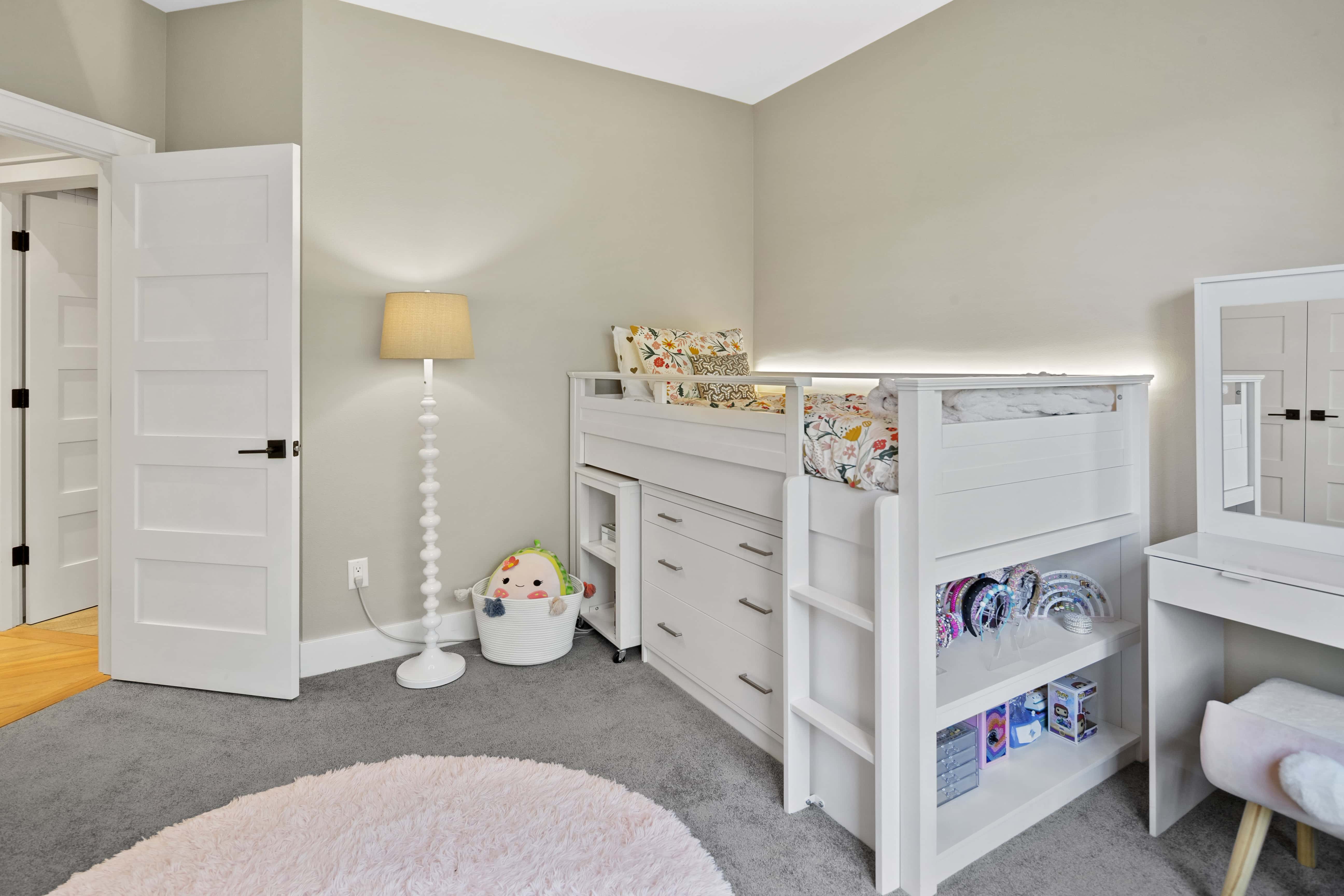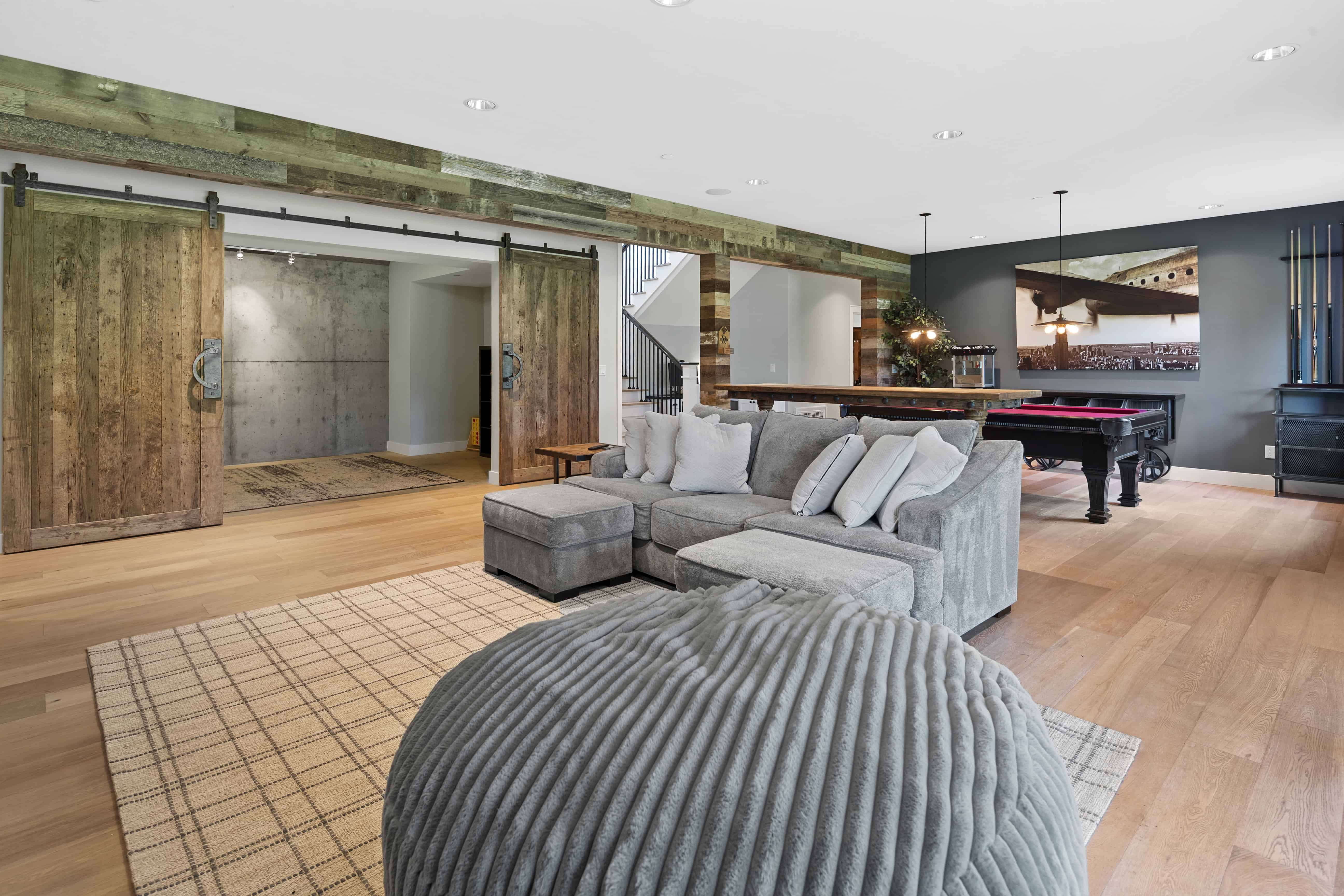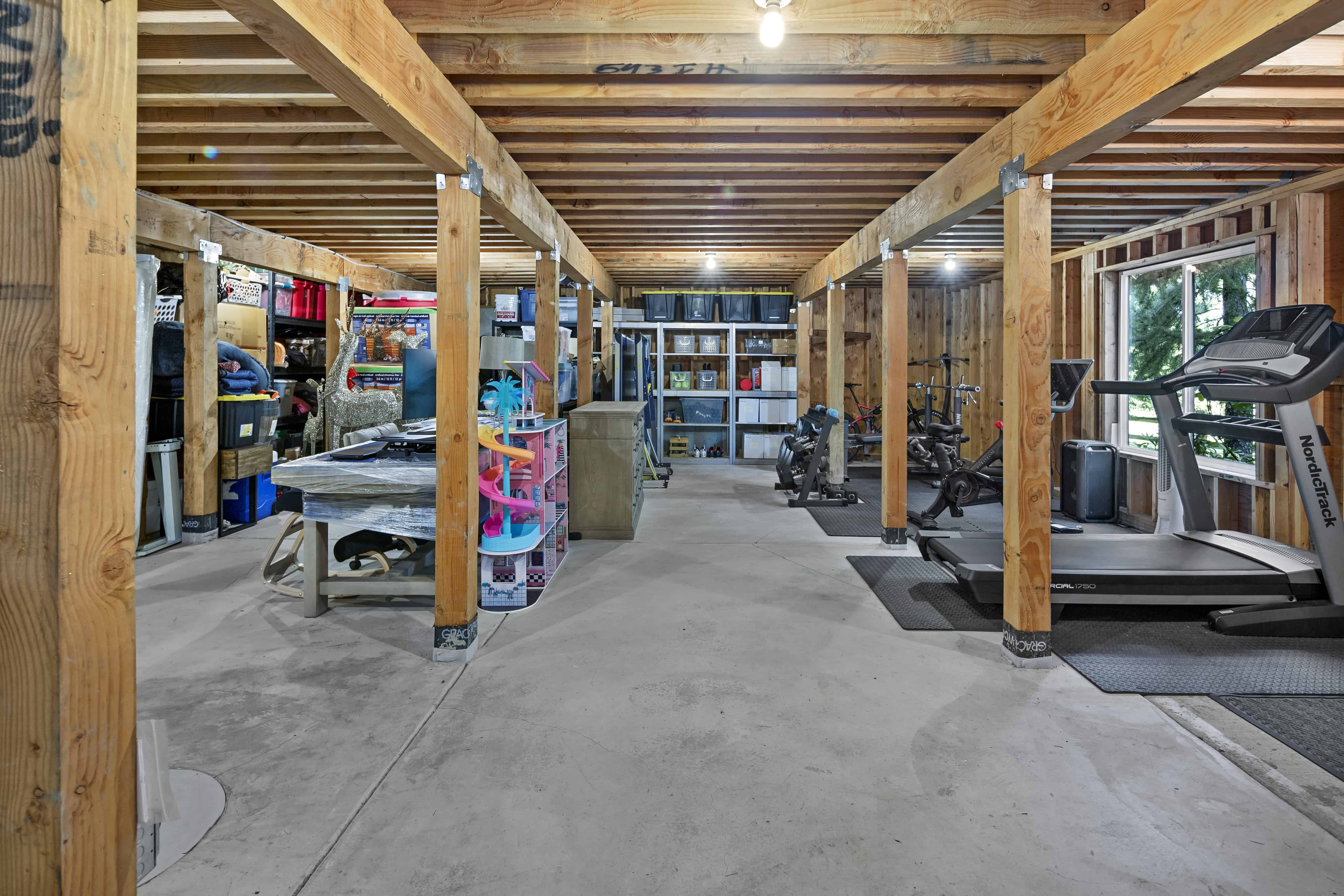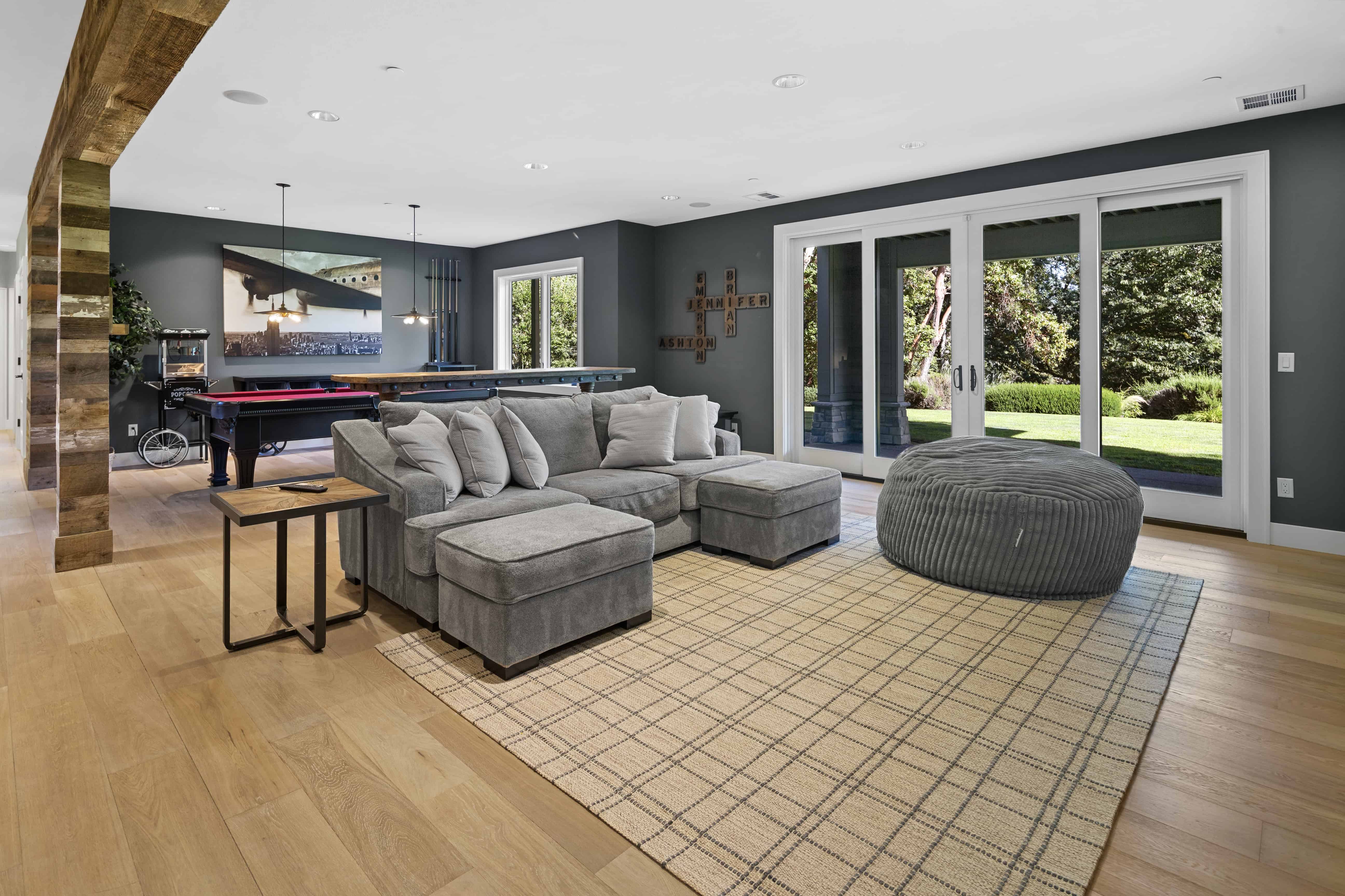 The lower level offers versatility with three bedrooms, two full baths (one en suite), and an expansive family room. Multiple flex spaces provide options for study, fitness, or play, while a partially-finished storage space with its own entrance allows for a potential guest quarter conversion.