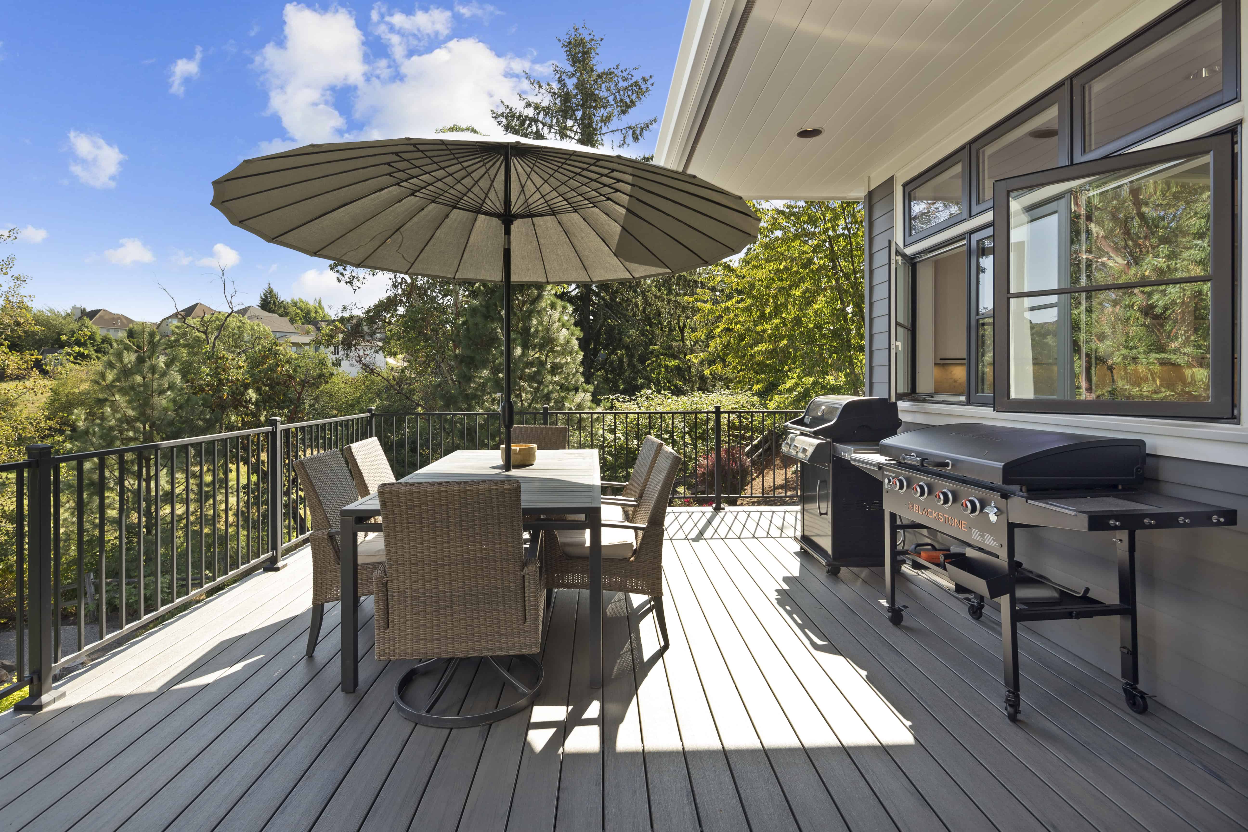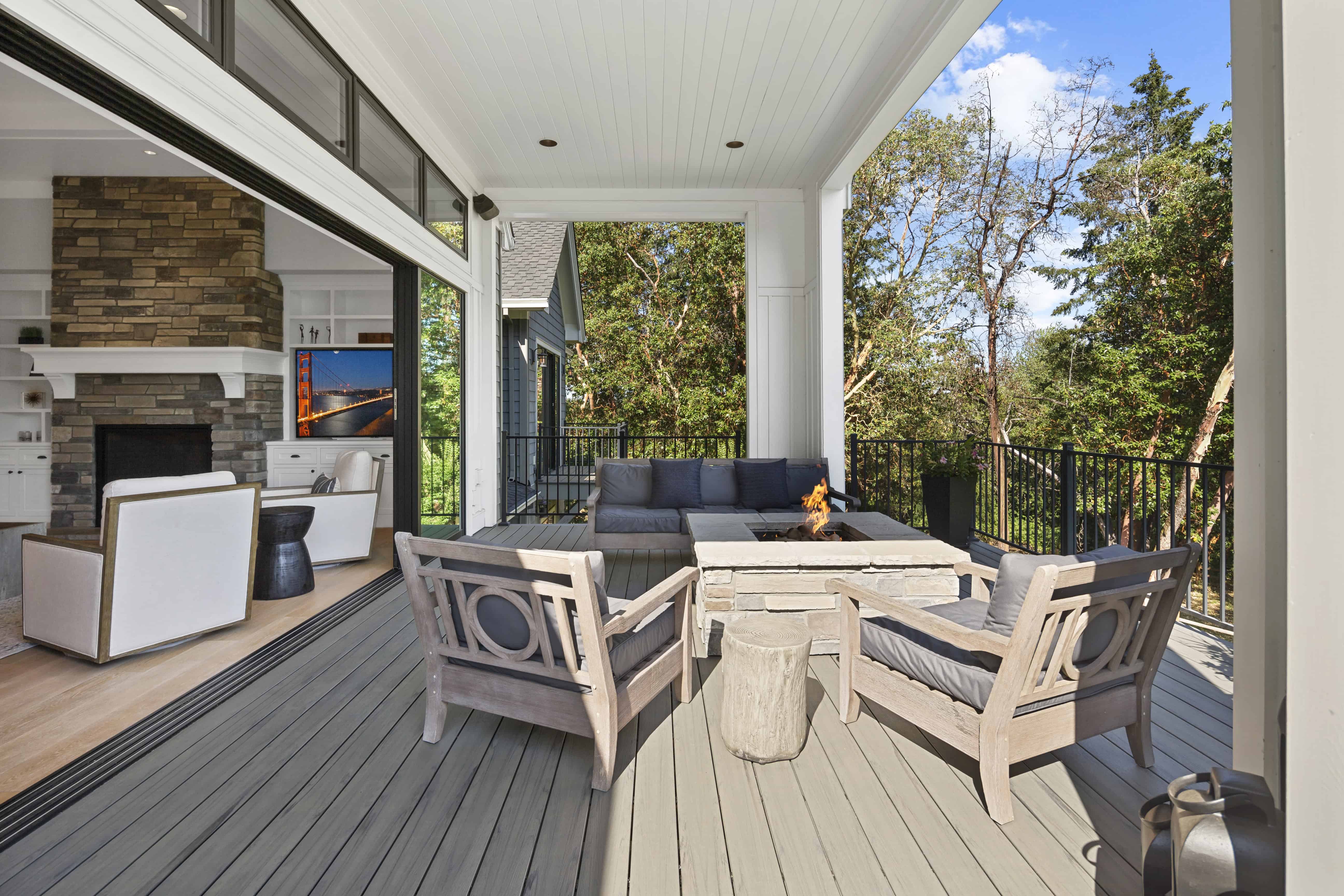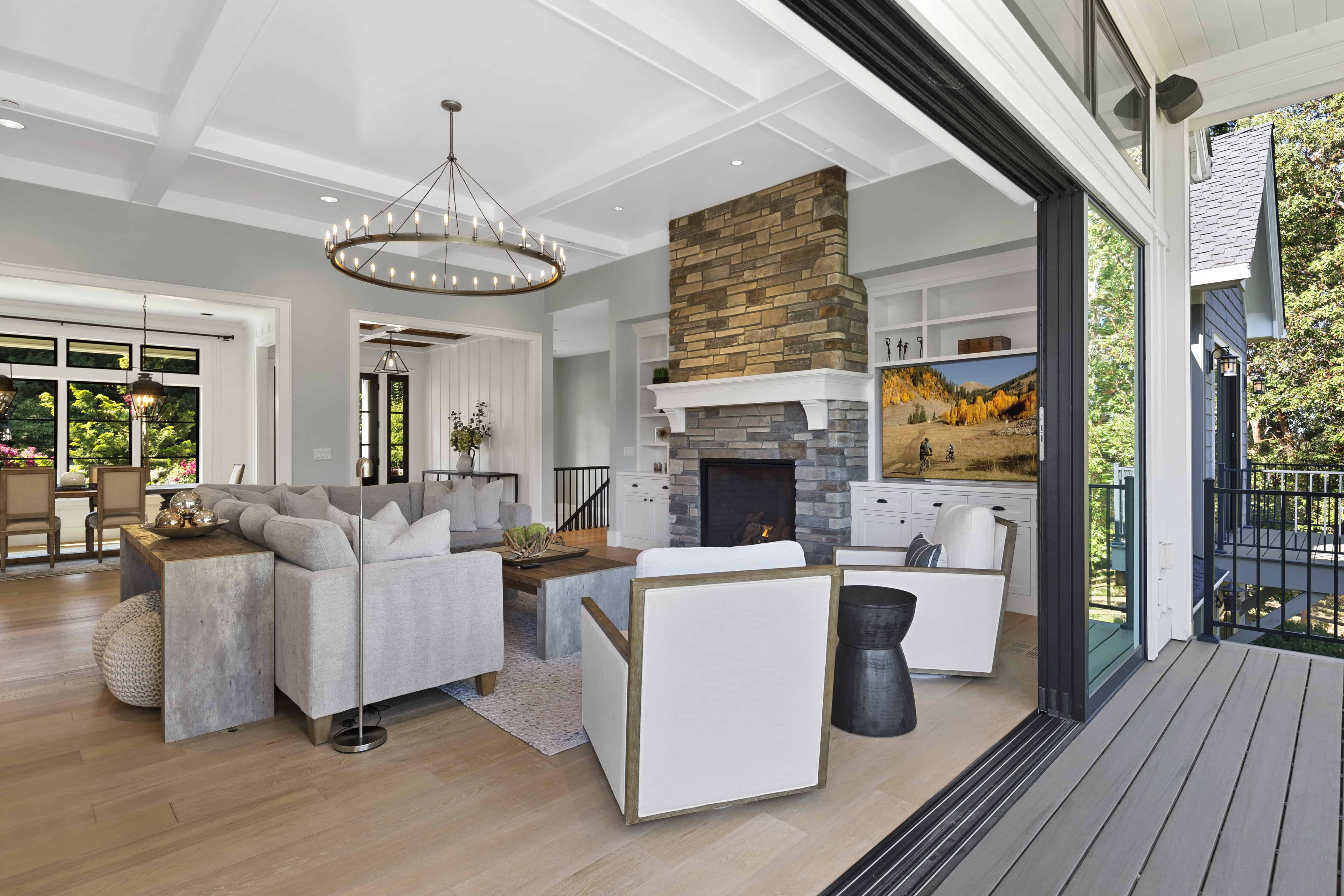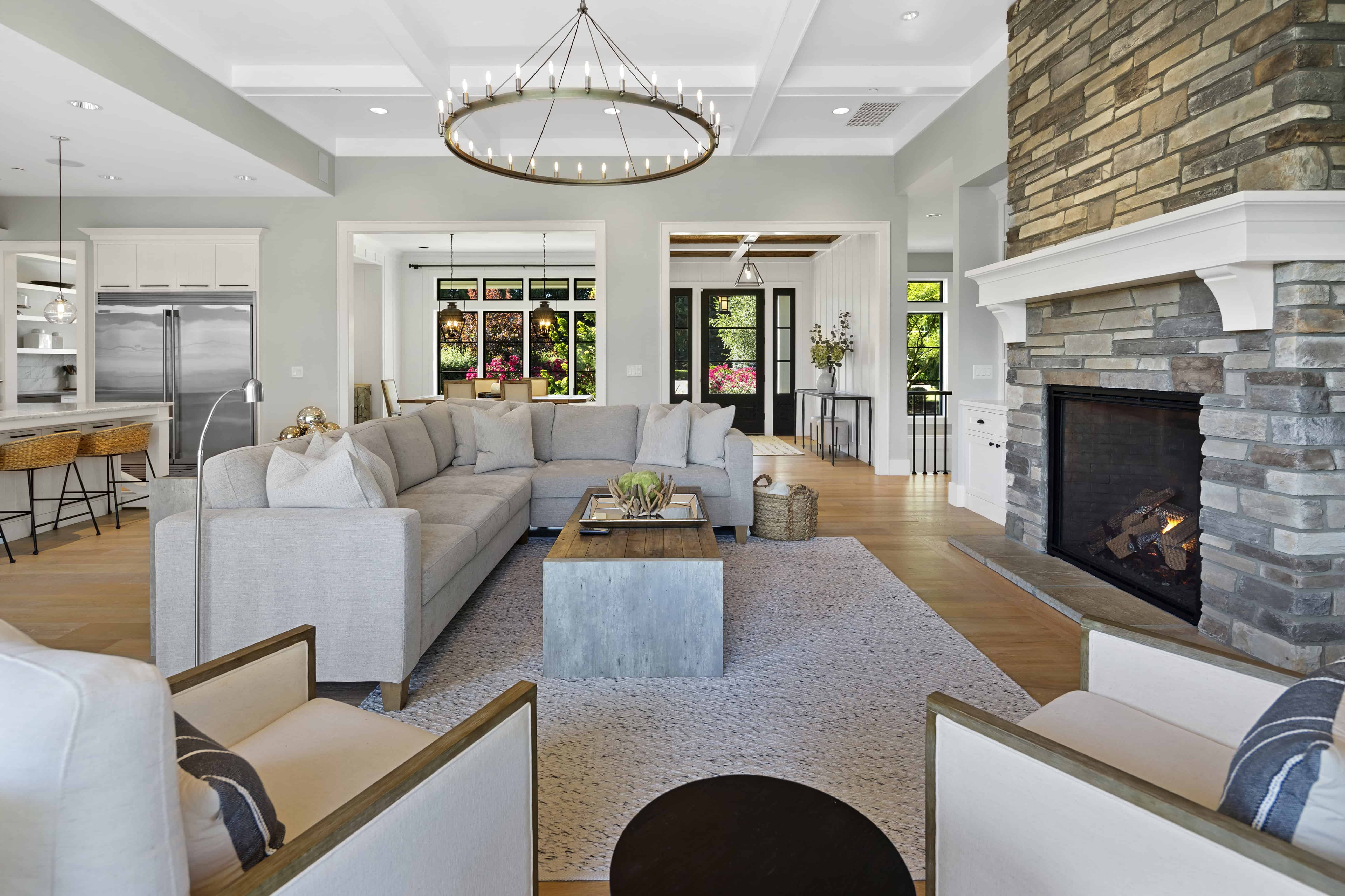At the heart of the home is a light-filled great room anchored by a stacked stone fireplace. Expansive sliding glass doorslead to newly restored composite deck, creating a seamless transition to an exceptional outdoor space with a built-in fire pit and dining area.